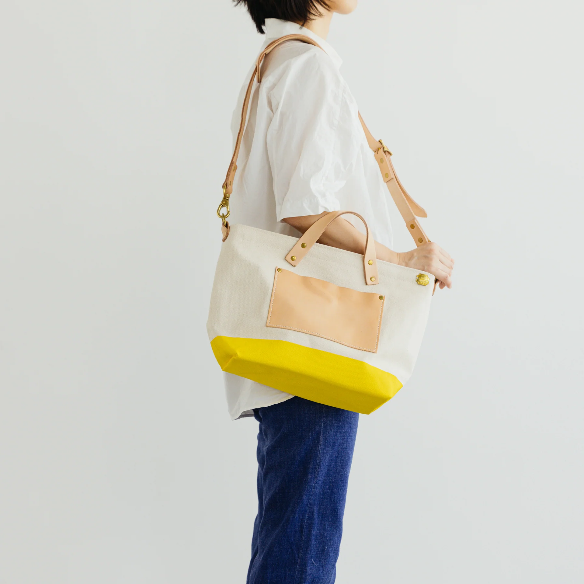 Gefertigt aus traditionellem Kurashiki-Canvas, pflanzlich gegerbtem Leder und massivem Messing, steht die Tasche für langlebige Materialien und kompromisslose Handwerkskunst. Vom Zuschneiden über das Nähen bis hin zum Bemalen und Stempeln wird jeder Arbeitsschritt von Hand in Japan ausgeführt.
